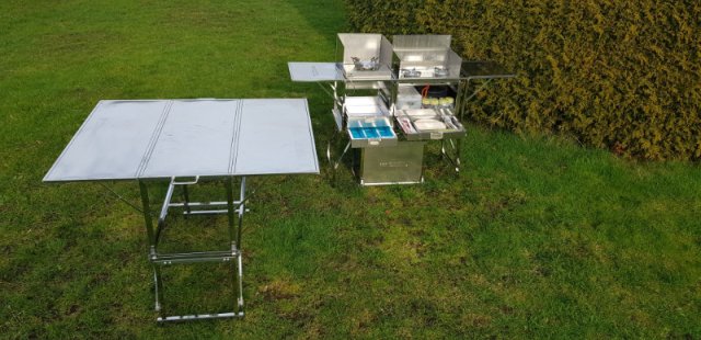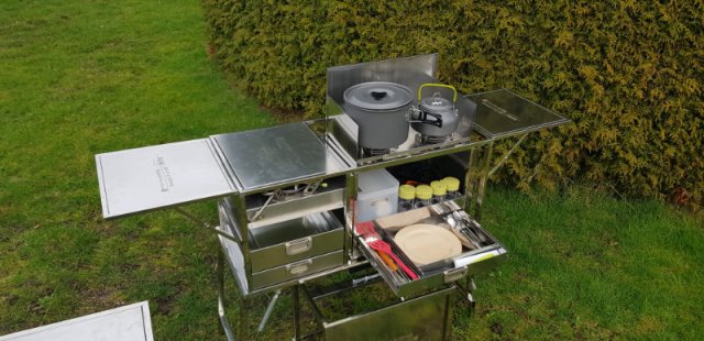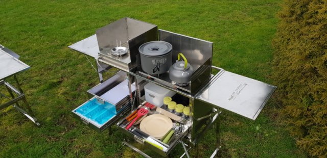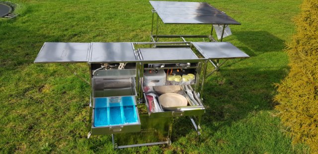 Welkom in uw nieuwe buitenkeuken! De Chuckbox XL is namelijk net zo goed als uw gewone keuken. Dankzij de twee grote branders en de grote wokbrander kunt u werkelijk elke maaltijd bereiden. Menig topkok is er jaloers op. Met de XL kunt u staand koken en hoeft u geen onhandige campingtafel meer mee te nemen. De XL Chuckbox wordt geleverd met een roestvrijstalen campingtafel die tevens dienst doet als opbergbox voor het geheel.