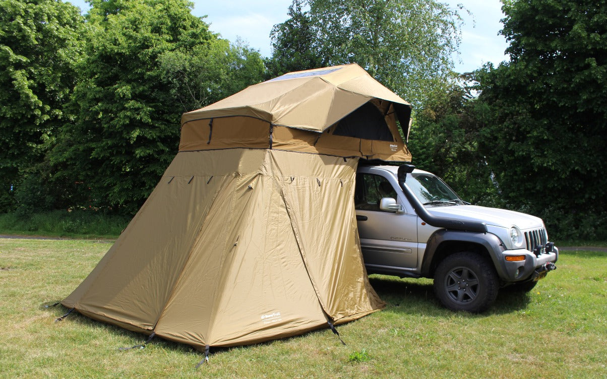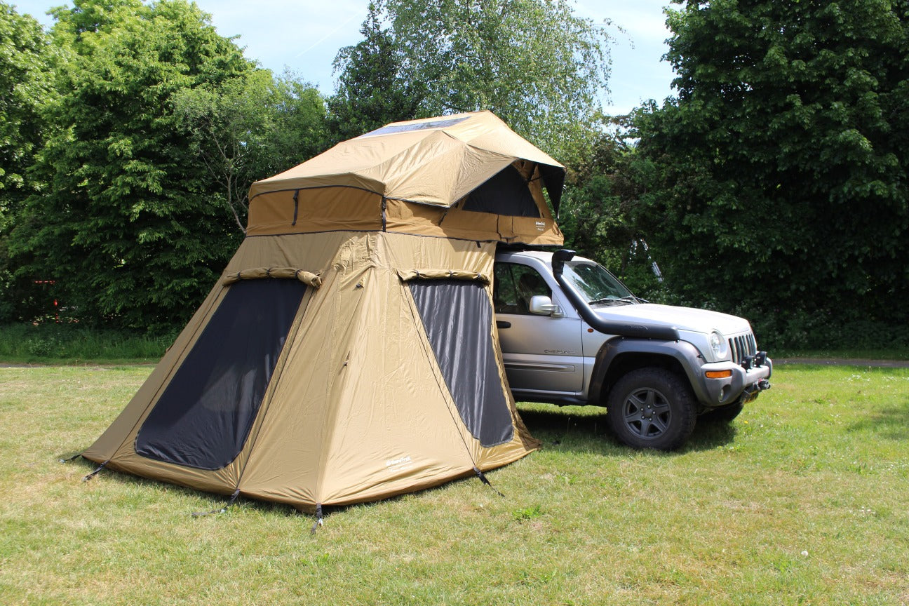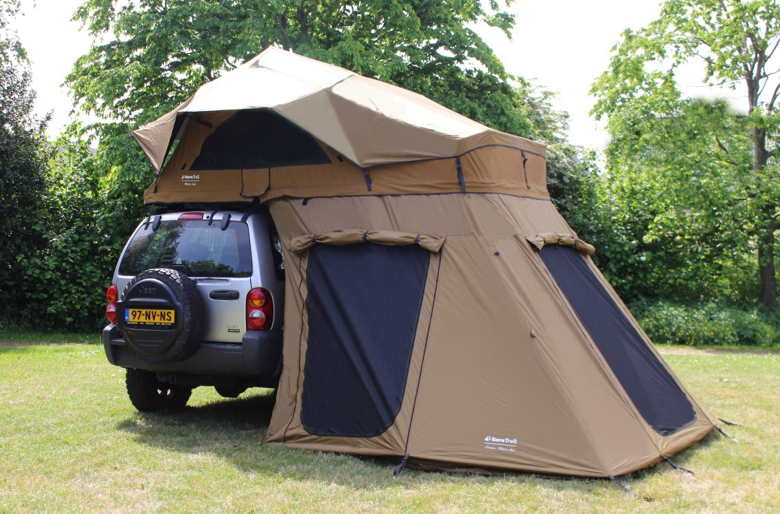 Deze tent is ideaal voor langere verblijven op één locatie. Hij biedt veel extra ruimte om te slapen of je kampeerspullen op te bergen. De achterwand van de tent is voorzien van een rits, waardoor je gemakkelijk bij je voertuig kunt komen.
